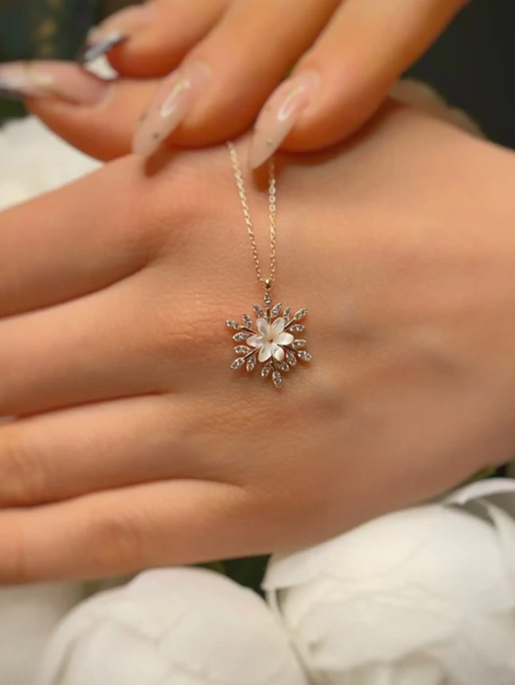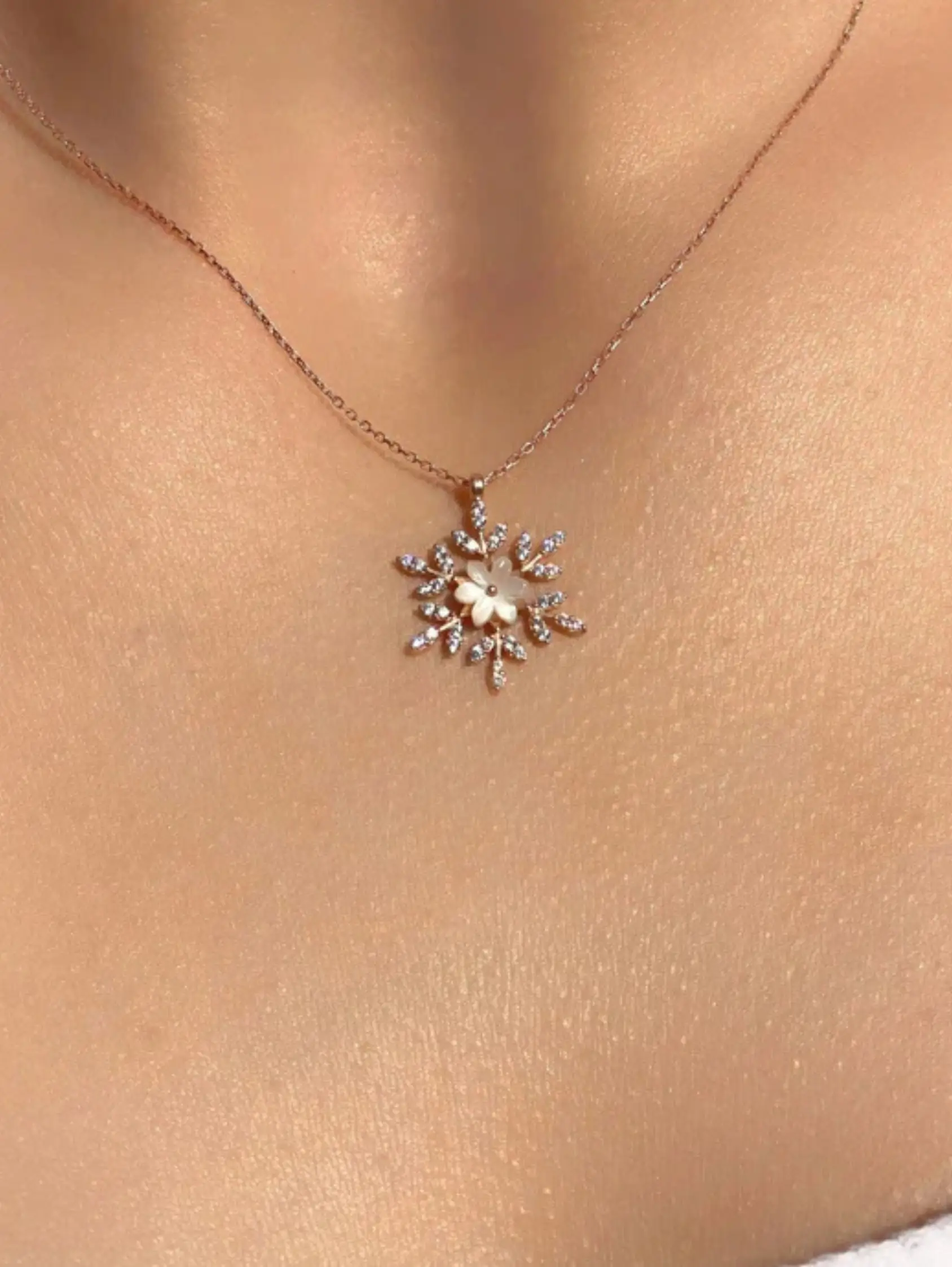 Inspired by the elegance of a snow-kissed bloom, this pendant features delicately arranged zircon-studded petals that sparkle with every turn, adding a soft, romantic glow to your look.