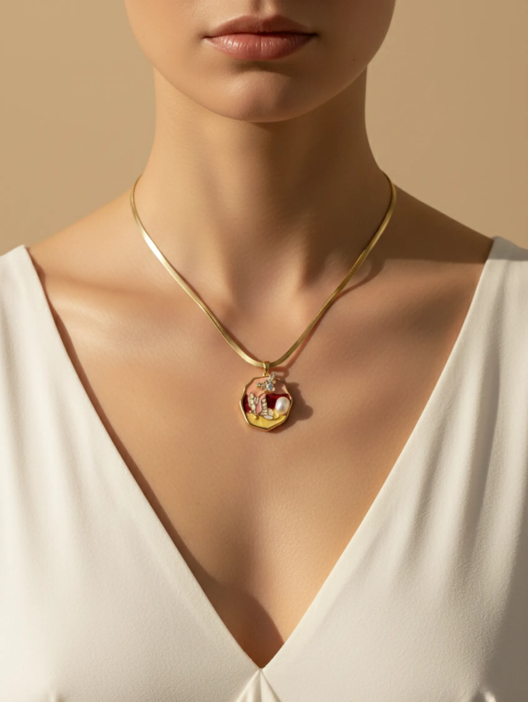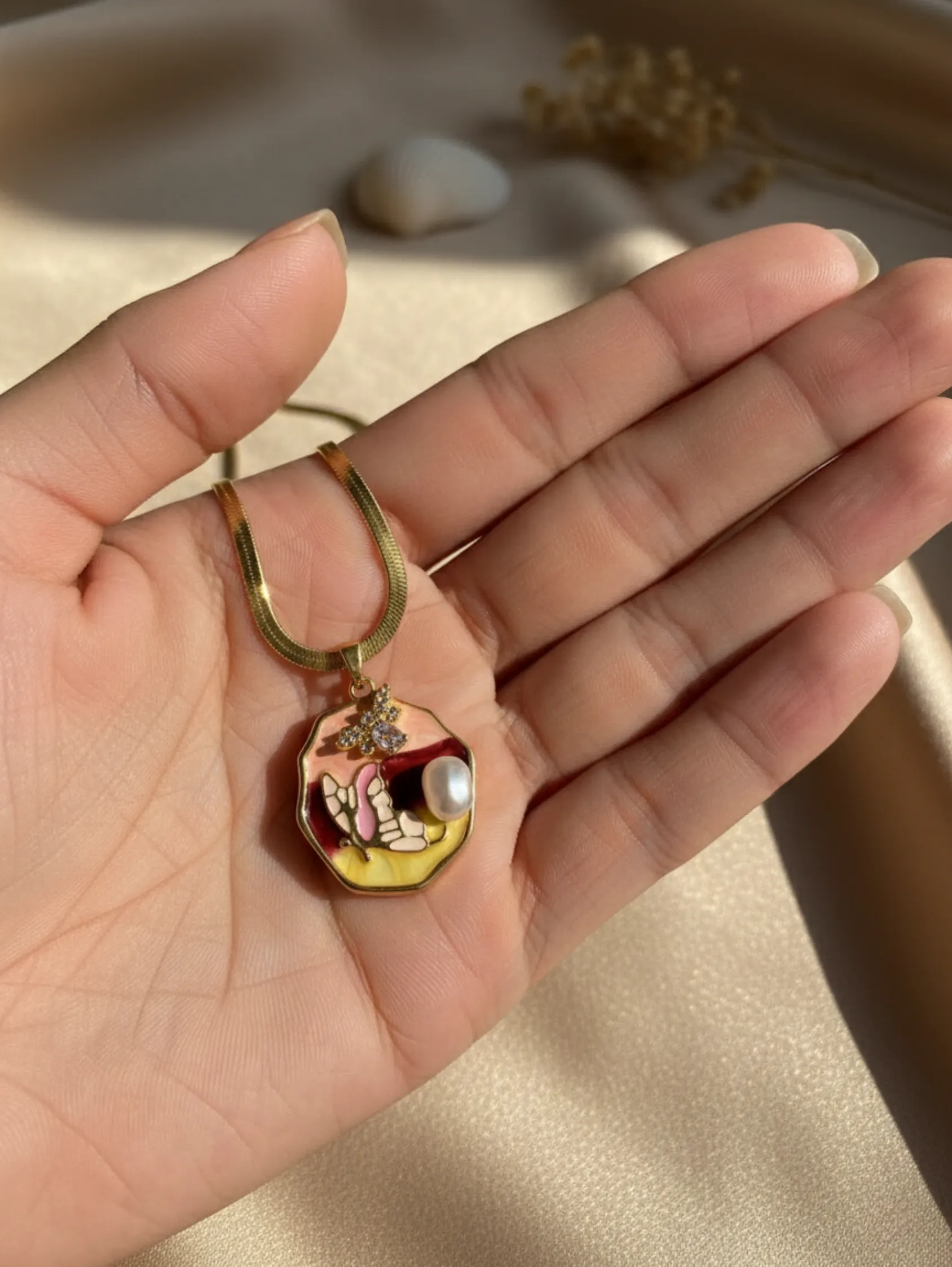 An artistic butterfly enamel pendant with a pearl accent — expressive, feminine, and beautifully unique.