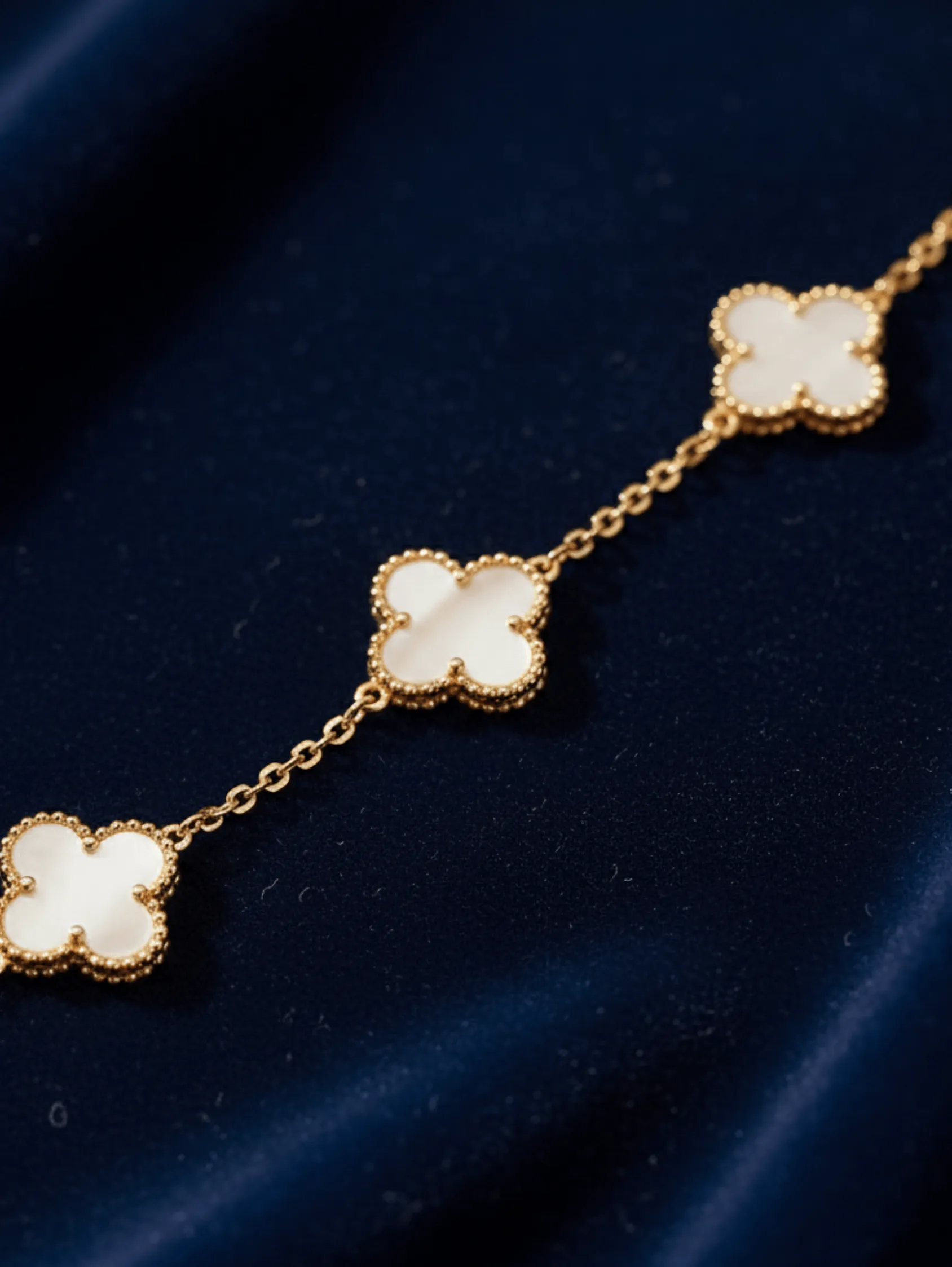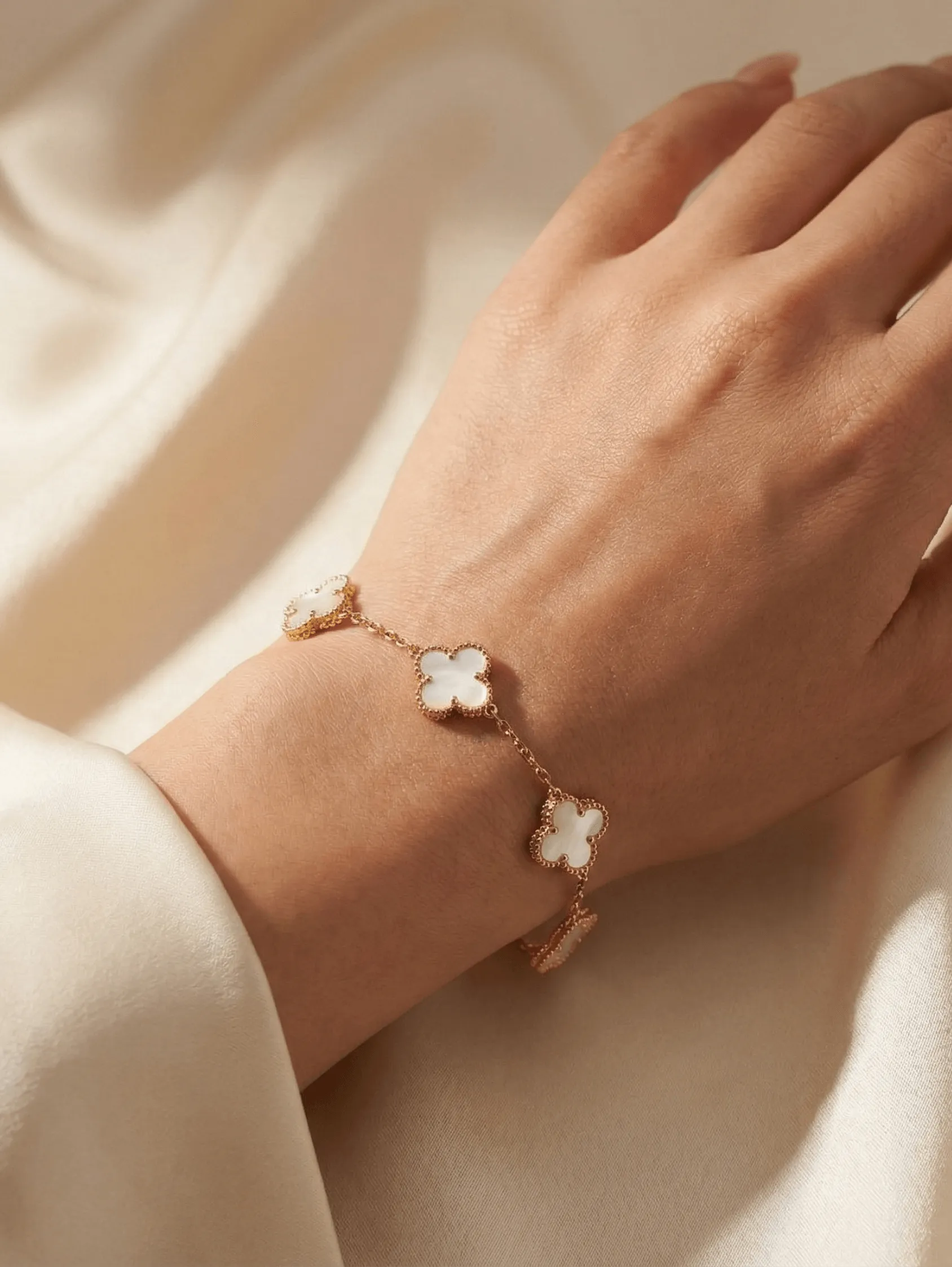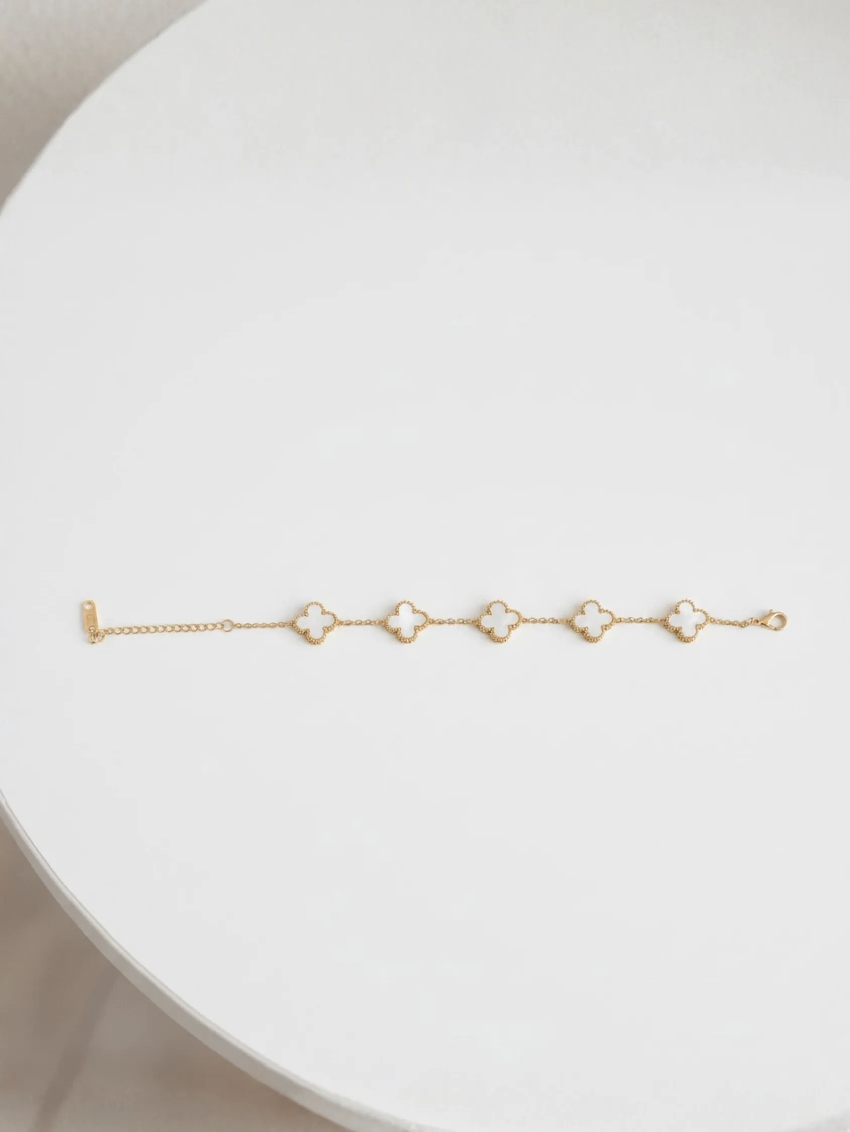 A graceful white enamel clover charm bracelet with a gold-toned finish - soft, feminine, and effortlessly stylish.